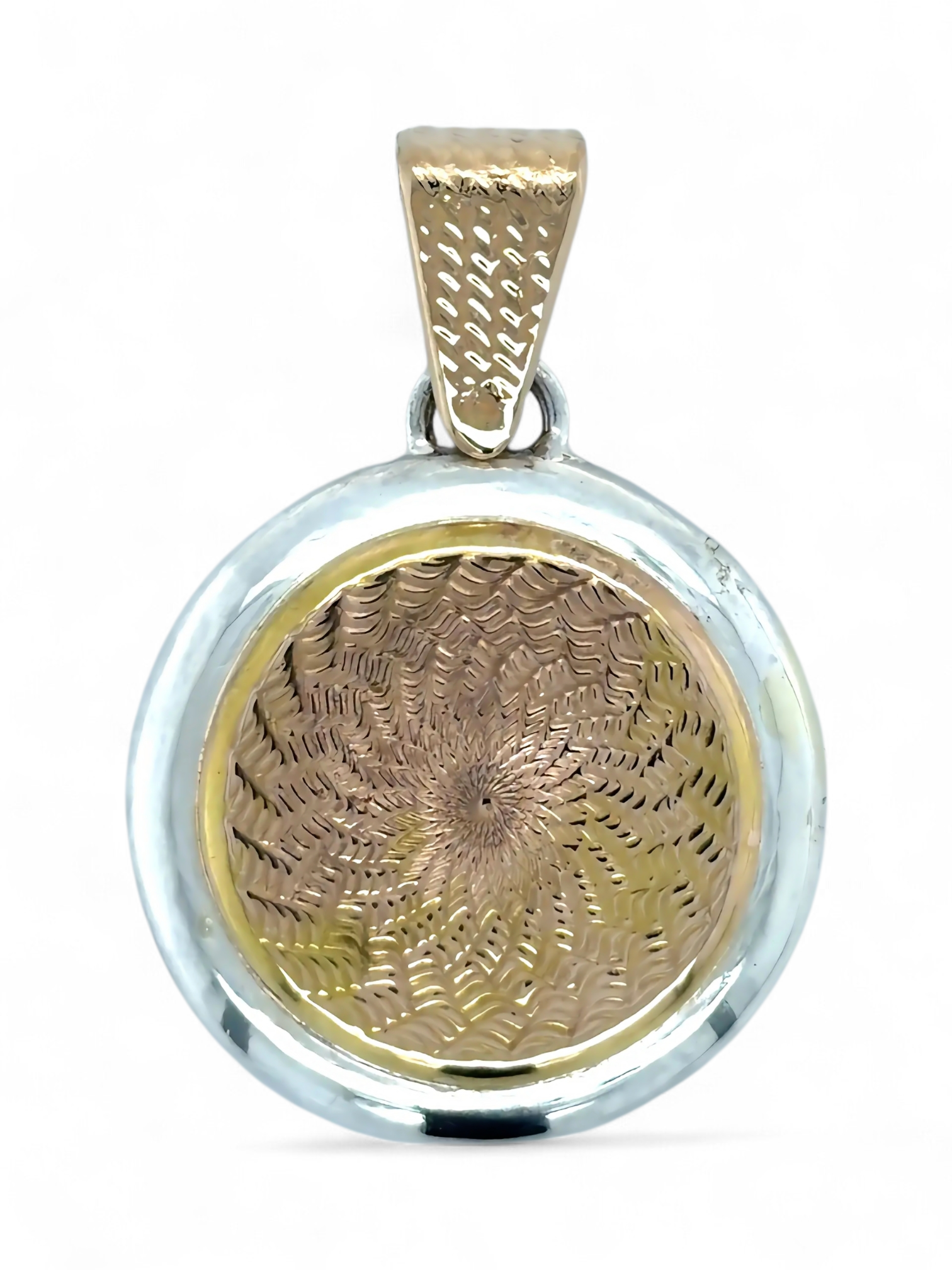 Completely handmade. Ernie Thomas uses various techniques and metals to create this unique and beautiful piece of two-tone jewelry.